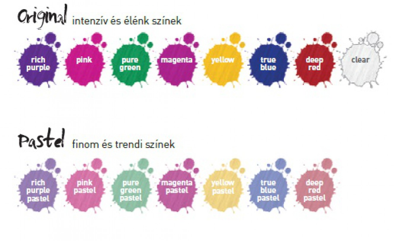 8 egymással keverhető szín, ami végtelen színválasztékot tesz lehetővé.